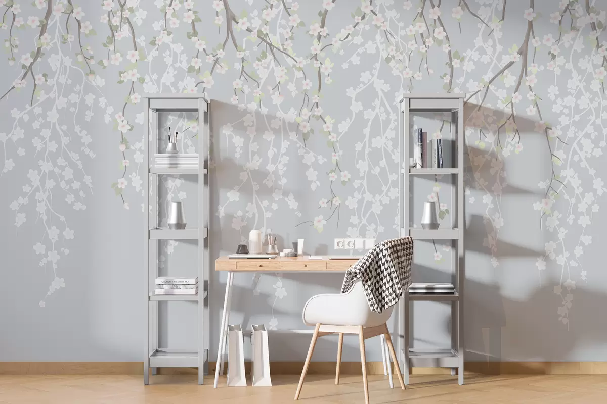Stenske poslikave Padajoče občutljive veje s cvetjem na modrem ozadju Št. w02479