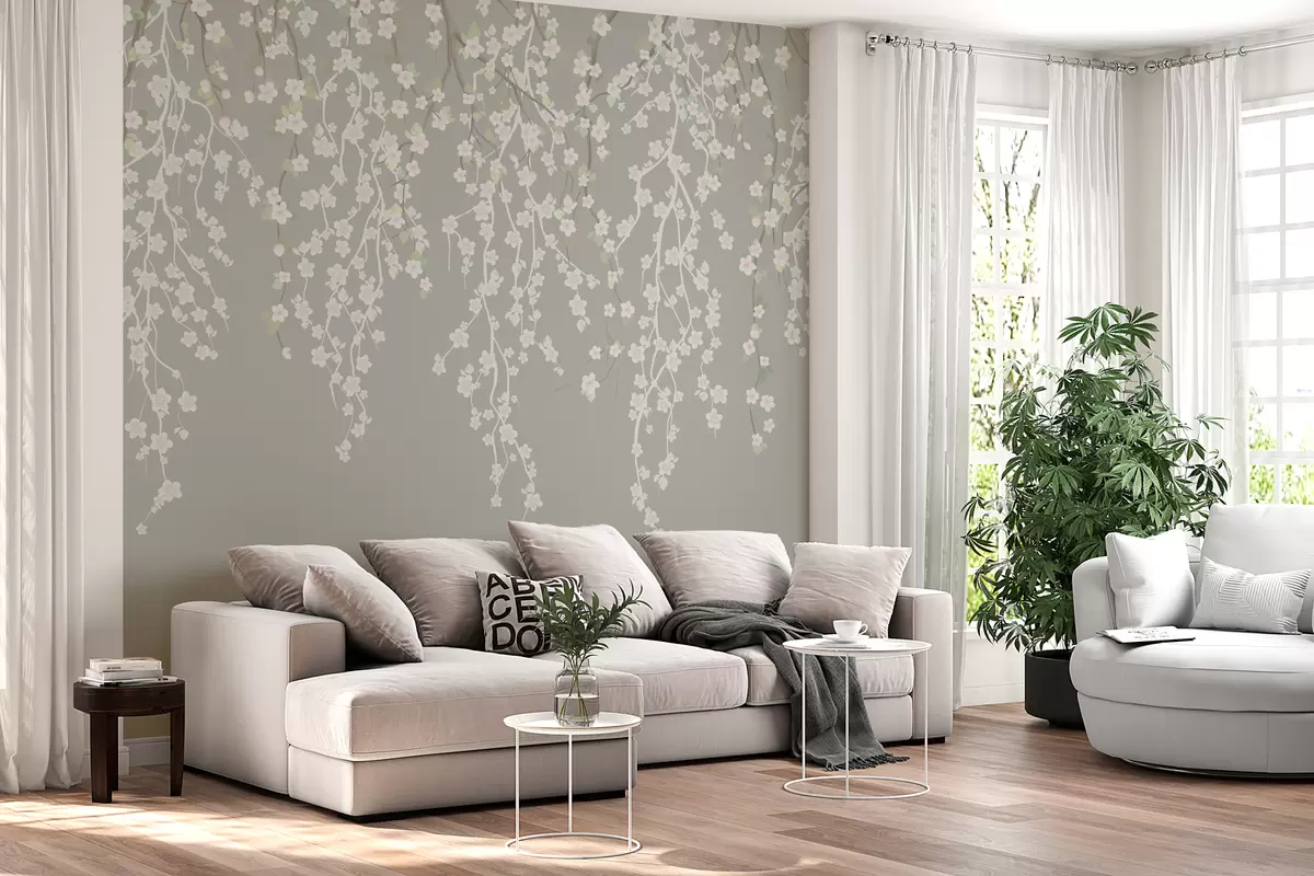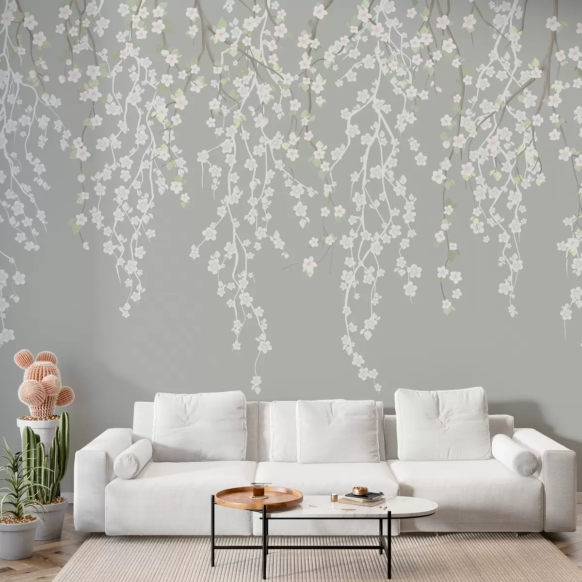 Stenske poslikave Tekoče občutljive veje s cvetjem na sivem ozadju Št. w02479v1