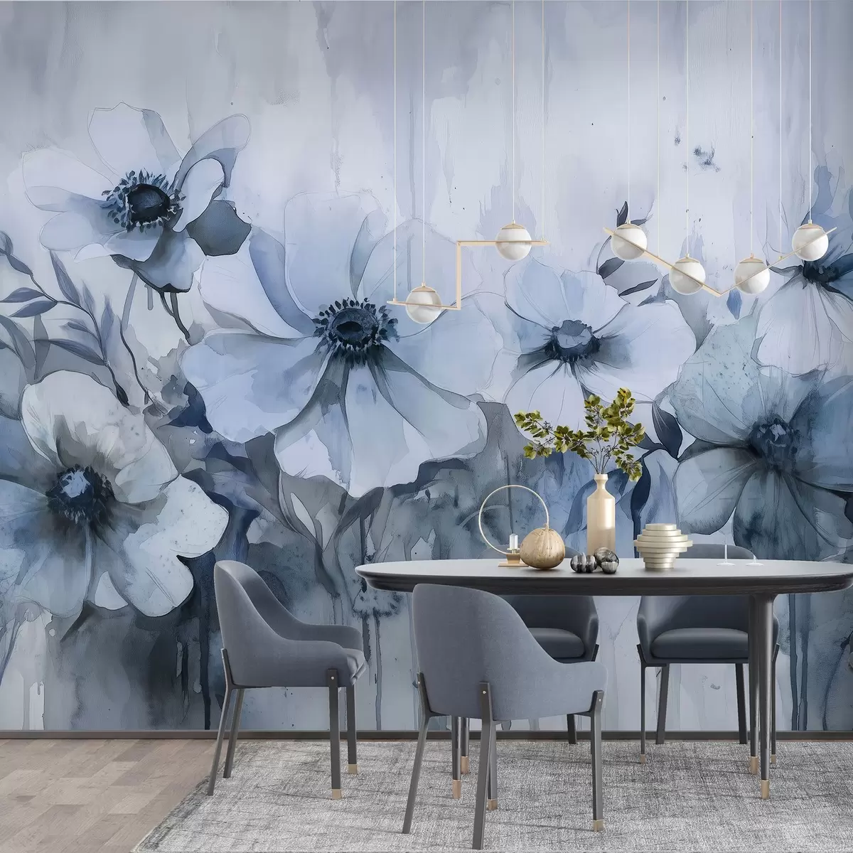 Stenske poslikave Rustikalne rože, risanje v stilu akvarela, modre barve Št. w02487v1