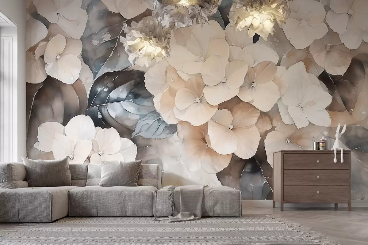 Stenske poslikave Hortenzija cvetje, akvarel slog risanje, bež barve, cvetlični Št. w02488