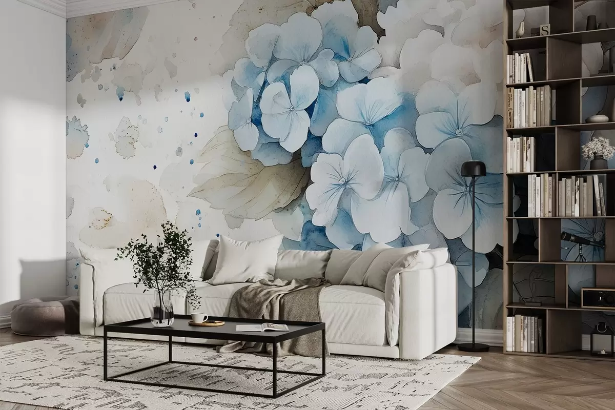 Stenske poslikave Akvarelna risba cvetov hortenzije z listi, mehke naravne barve Št. w02493