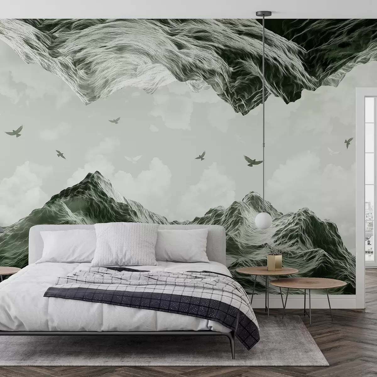 Stenske poslikave Gore pokrajina, realizem, leteče ptice, narava, oblaki, zelene barve Št. w02514v3
