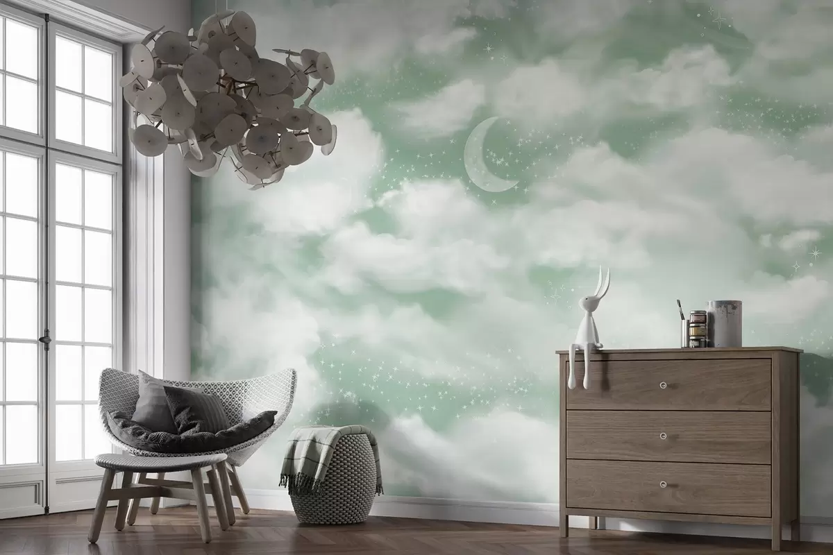 Stenske poslikave Zvezdnato nebo z luno in oblaki, zasanjano, eterično, mehke zelene barve Št. w02515v2