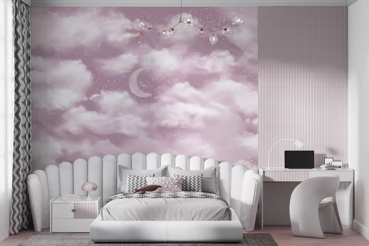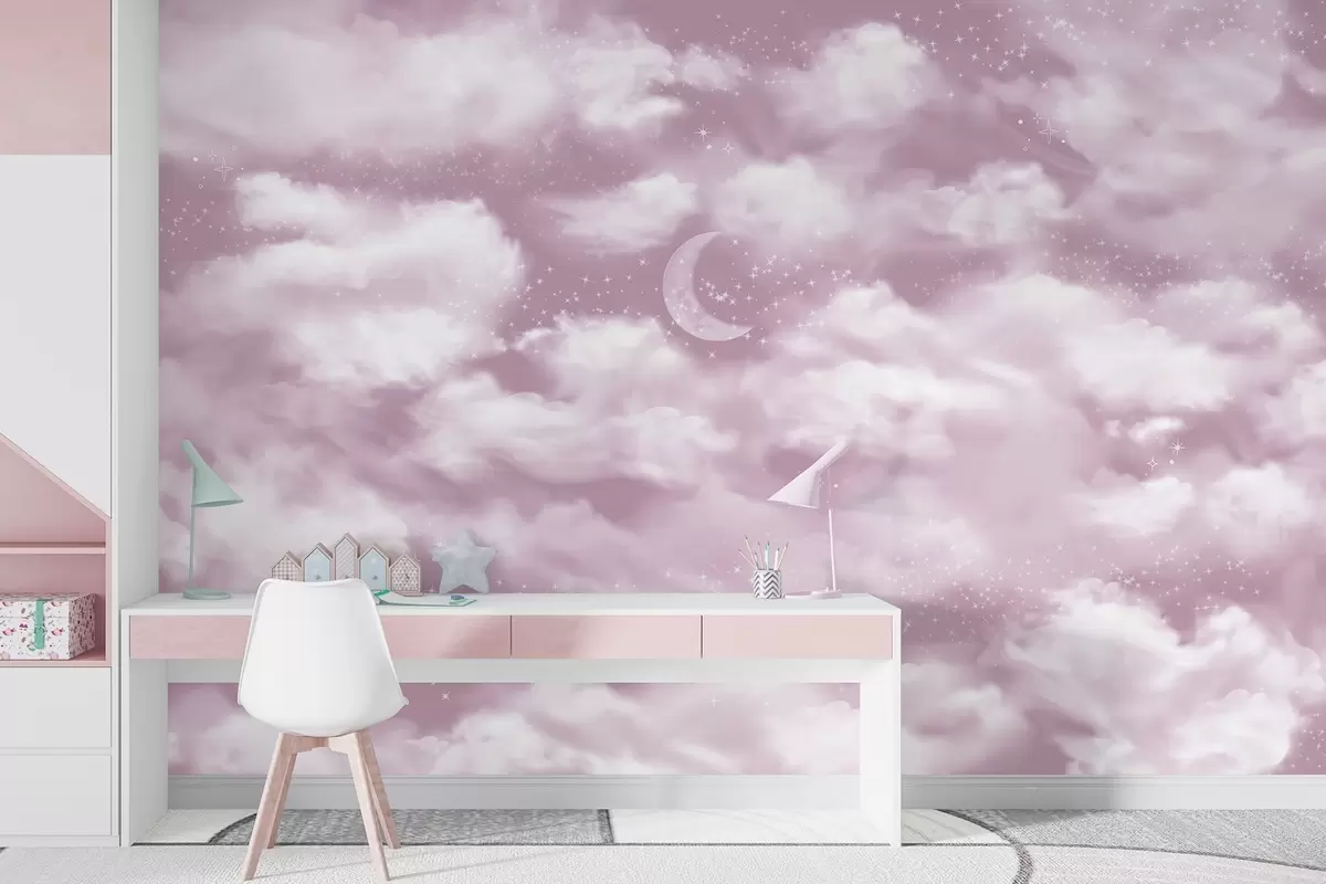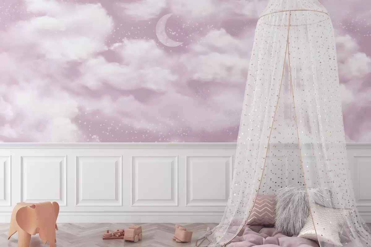 Stenske poslikave Zvezdnato nebo z luno in oblaki, zasanjano, eterično, mehke rožnate barve Št. w02515v3