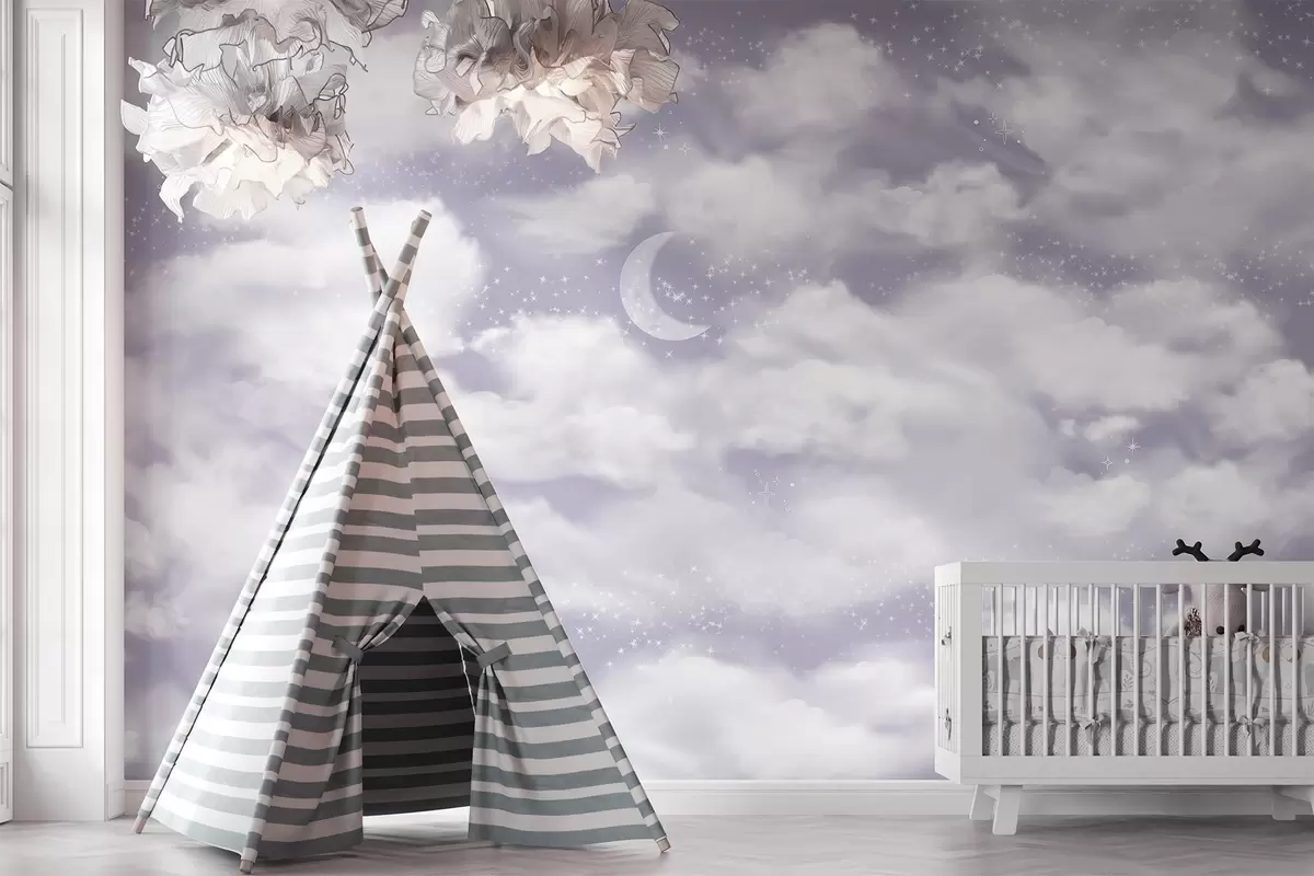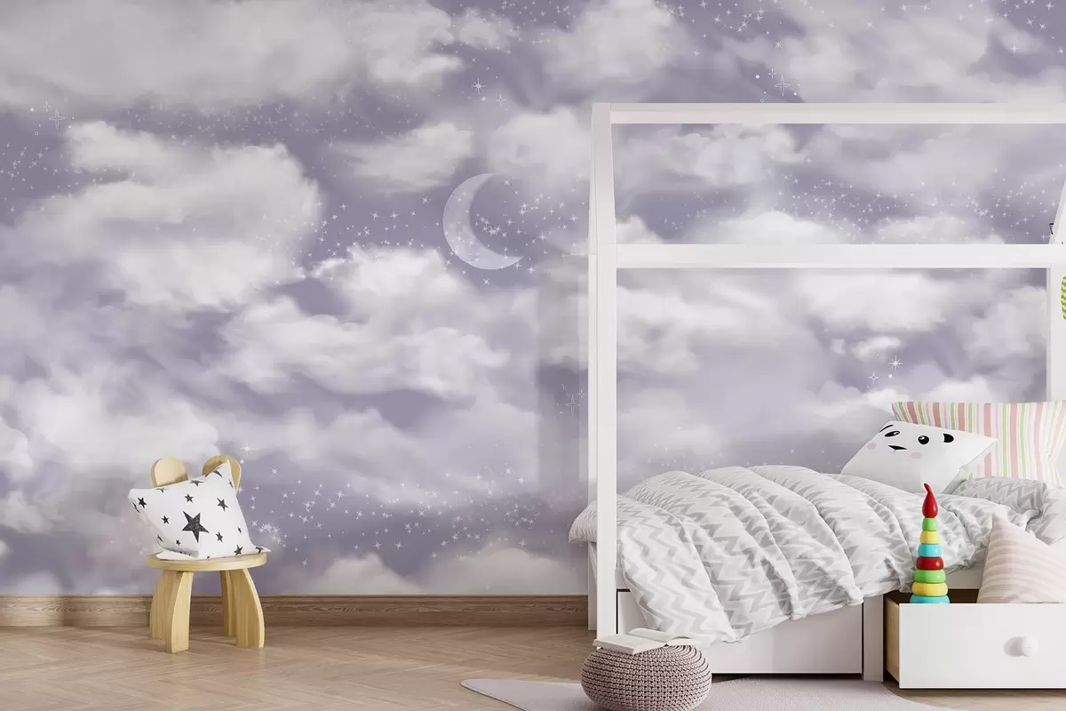 Stenske poslikave Zvezdnato nebo z luno in oblaki, zasanjano, eterično, mehke vijolične barve Št. w02515v4