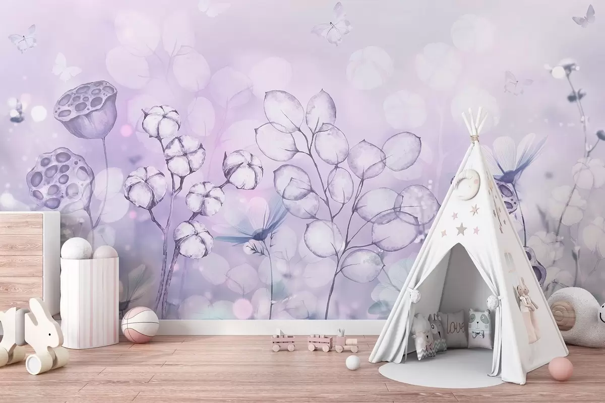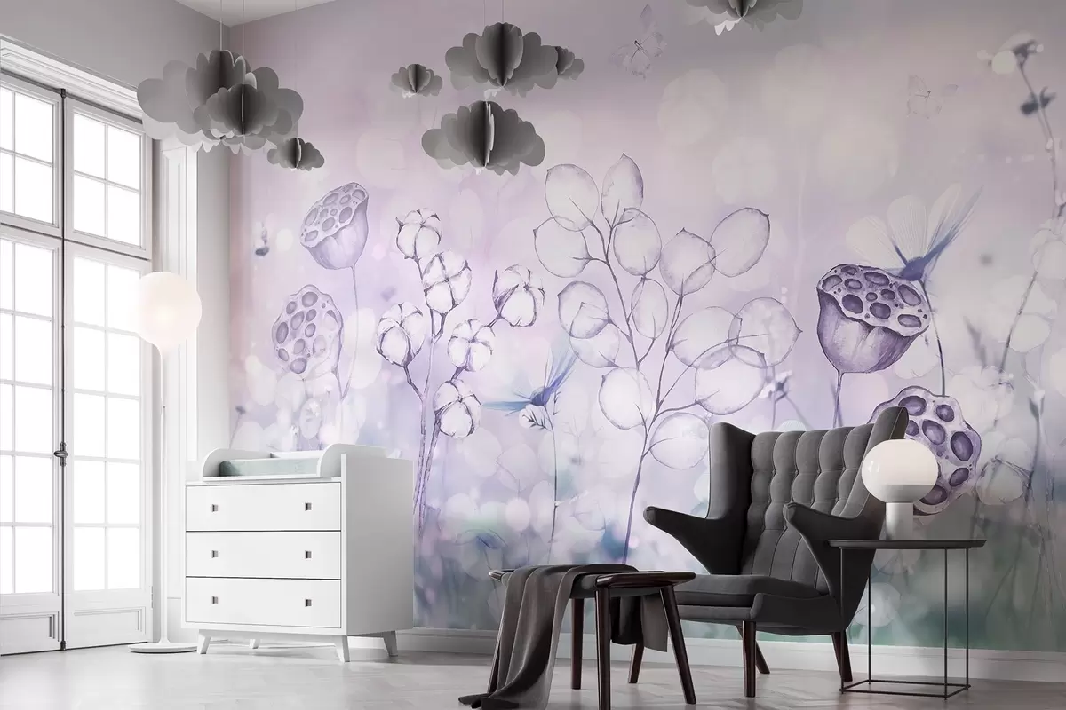 Stenske poslikave Sanjski cvetlični vrt, metulj, bombažni cvetovi, lotosi, vijolične barve Št. w02516v1