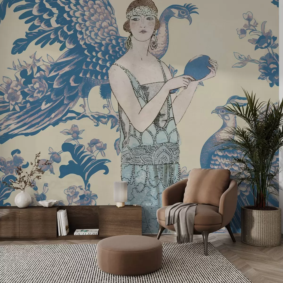 Stenske poslikave Eleganten vintage cvetlični vzorec z žensko v modrih in rožnatih odtenkih Št. w02532