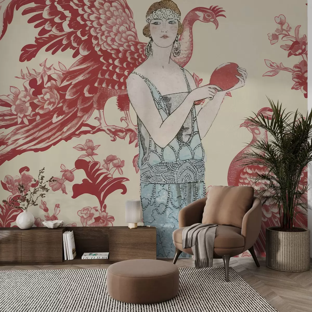 Stenske poslikave Eleganten vintage cvetlični vzorec z žensko v rdečih barvah Št. w02532v1