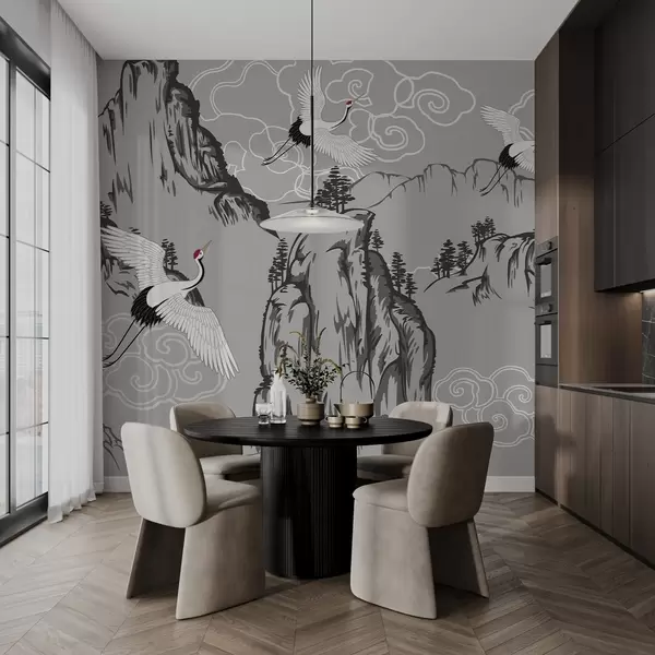 Stenske poslikave Gore in žerjavi v japonskem slogu v sivih tonih Št. w02544v1
