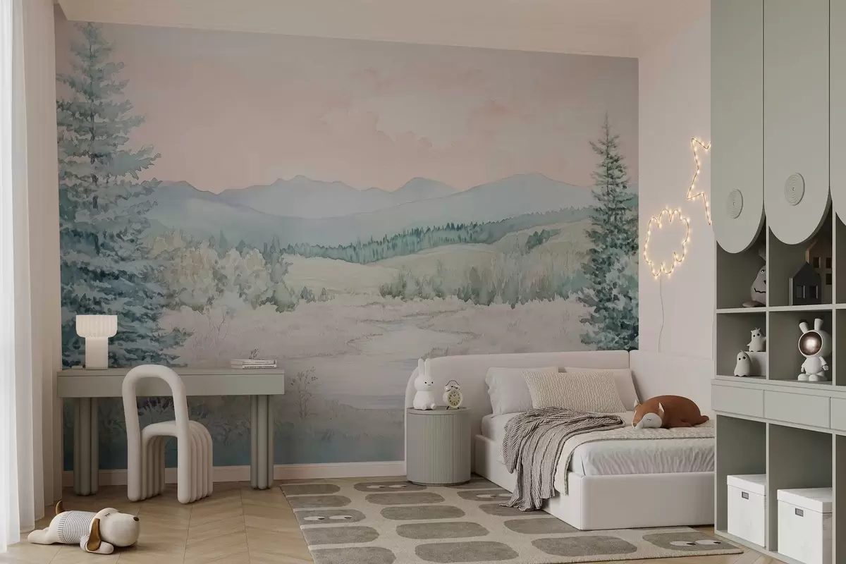 Stenske poslikave pokrajina v akvarelnem slogu z jelkami Št. w02689
