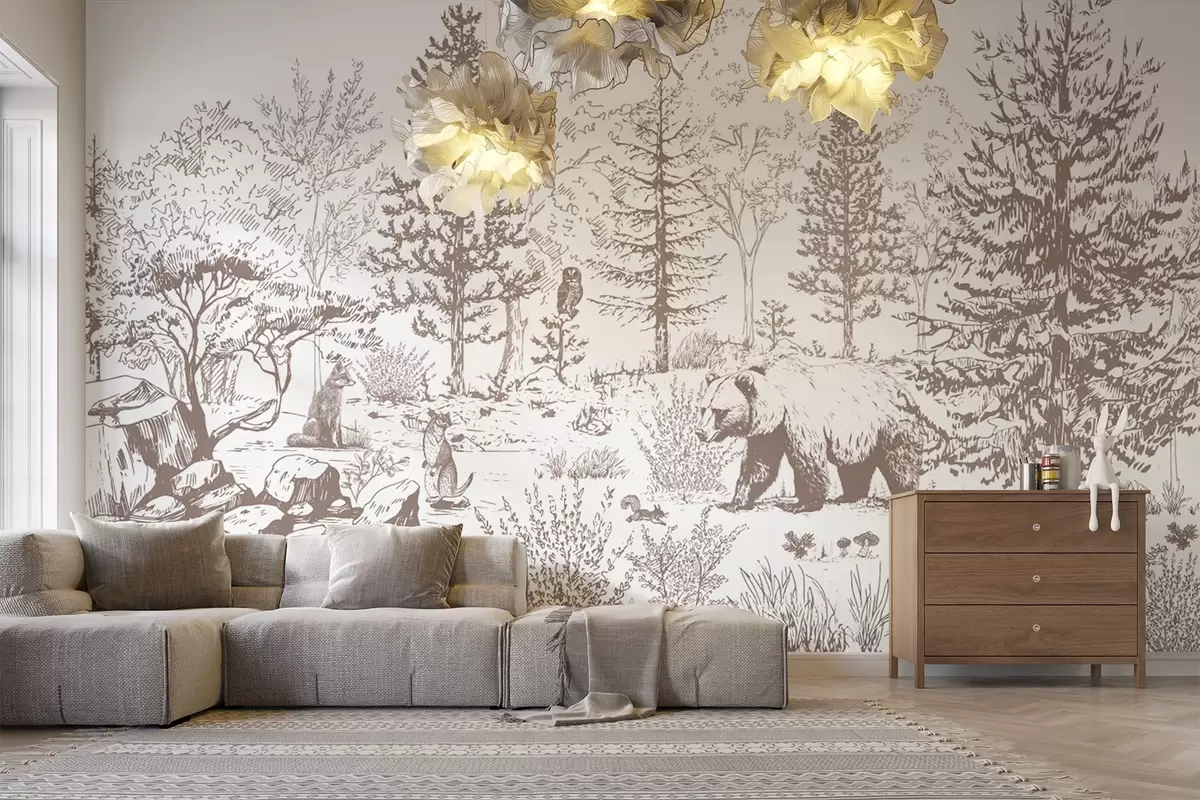Stenske poslikave Življenje v gozdu, drevesa, divje živali, medved, lisica, sova, grmovje, risba v slogu svinčnika, bež barve Št. w02929