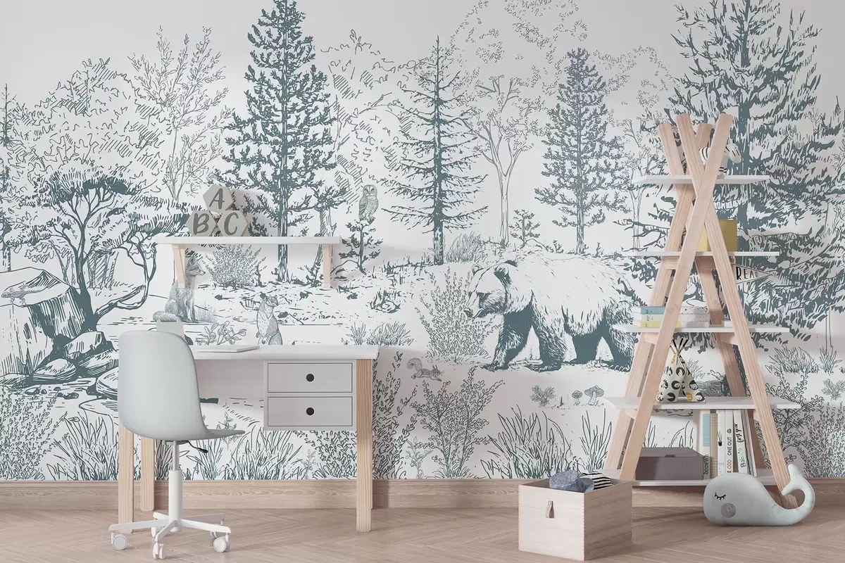 Stenske poslikave Življenje v gozdu, drevesa, divje živali, medved, lisica, sova, grmičevje, risba v slogu svinčnika, modre barve Št. w02929v1