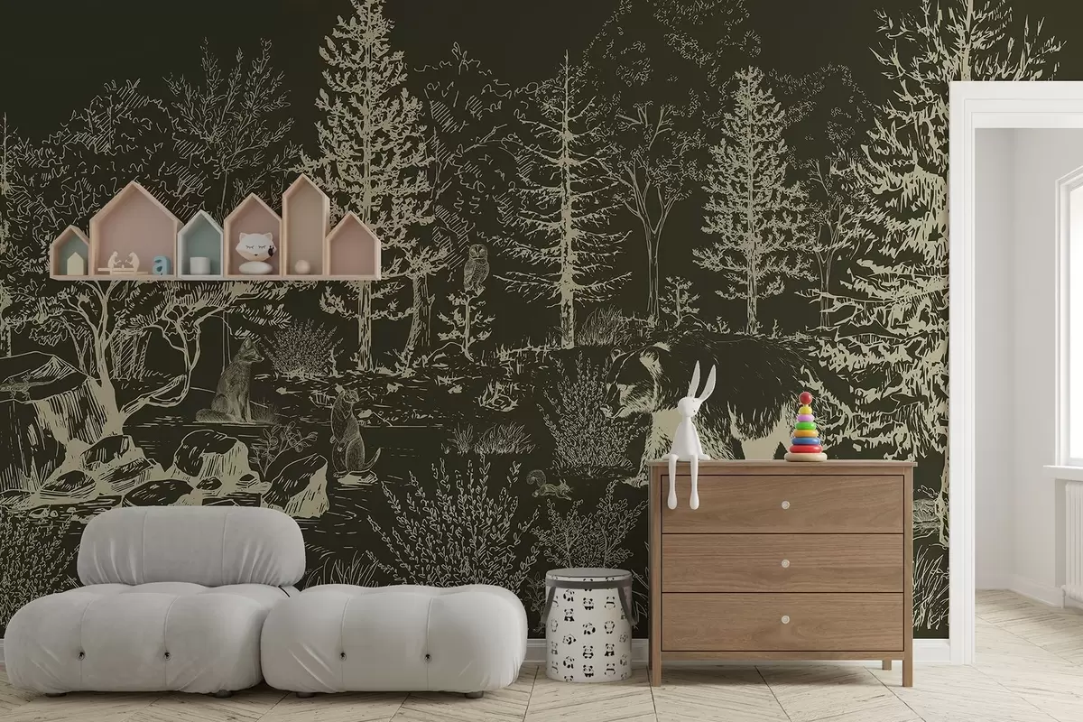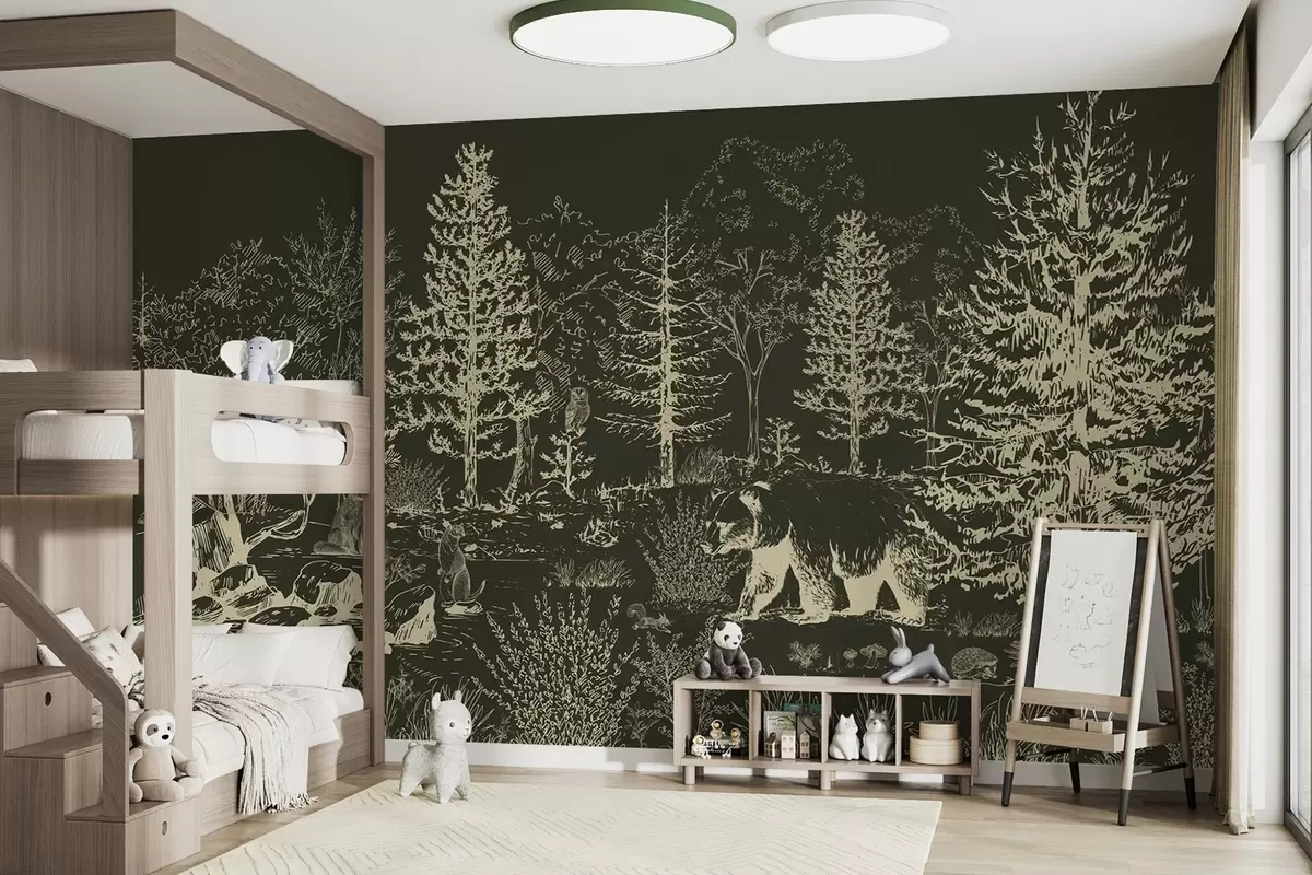 Stenske poslikave Življenje v gozdu, drevesa, divje živali, medved, lisica, sova, grmovje, temno zeleno ozadje Št. w02929v3