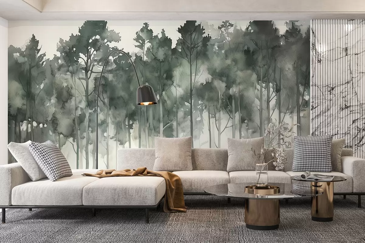 Stenske poslikave Akvarelni slog gozd, borovci, naravna pokrajina, zelene barve Št. w02937