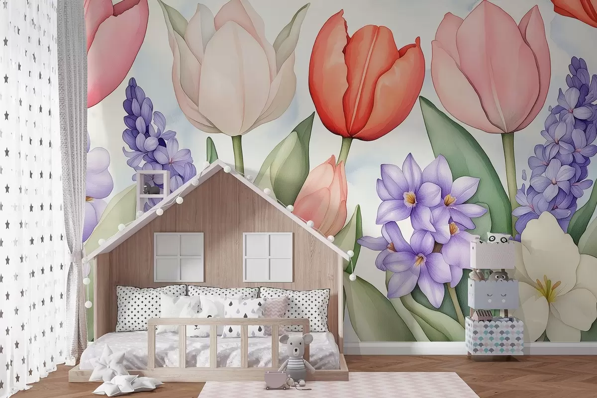 Stenske poslikave Pomladno cvetje, tulipani, hijacinta, akvarelni slog risanje, cvetlični Št. w02940