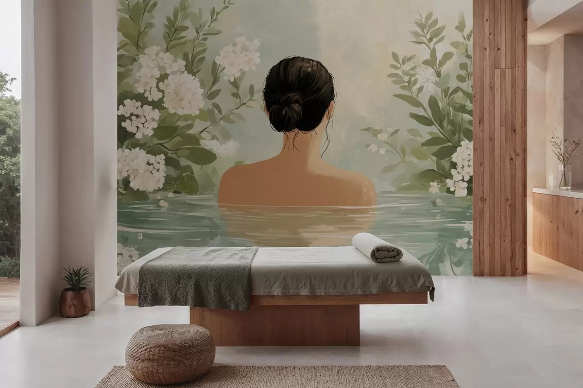 Stenske poslikave mirna in zasanjana botanična ilustracija ženske, ki se kopa v mirni, odsevni vodi, obdani z bujnim zelenjem in nežnimi belimi cvetovi. Št. w03014