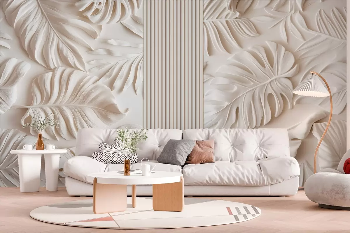 Stenske poslikave veliki tropski listi, imitacija basreliefa in plošče v svetlih barvah Št. w03119