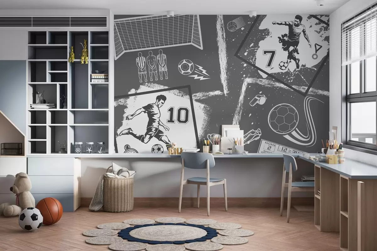 Stenske poslikave Nogometaši, žoga in drugi nogometni atributi v sivih tonih Št. w03122v1