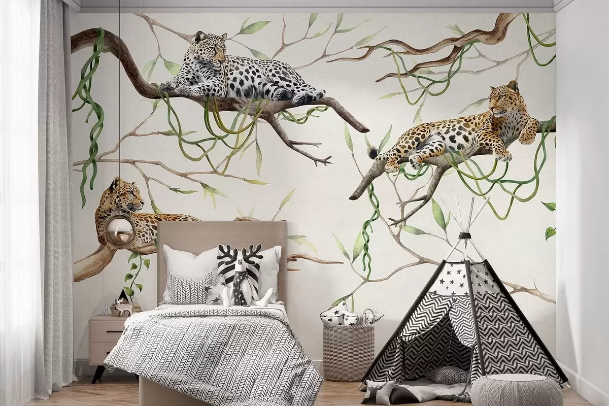 Stenske poslikave Leopardi na drevesih džungle, liane, tropske, divje živali, naravna barvna paleta Št. w03146