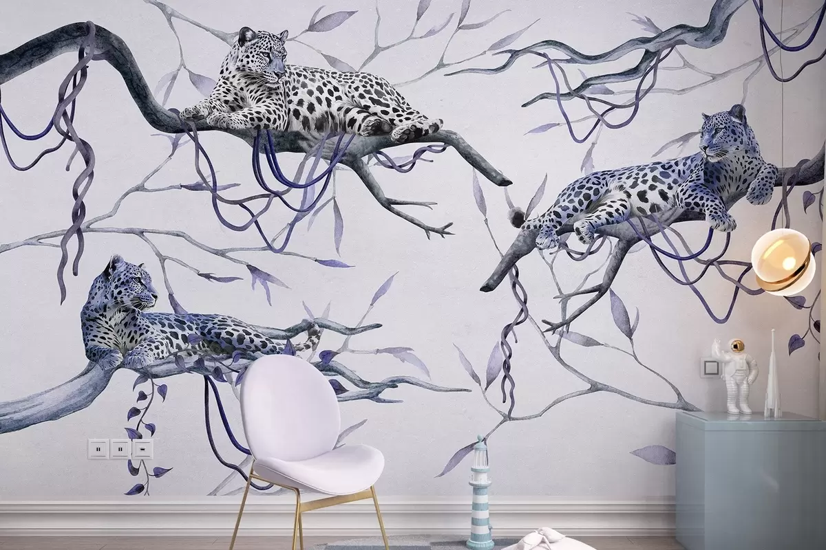 Stenske poslikave Leopardi na drevesih džungle, liane, tropske, divje živali, vijolična barvna paleta Št. w03146v3