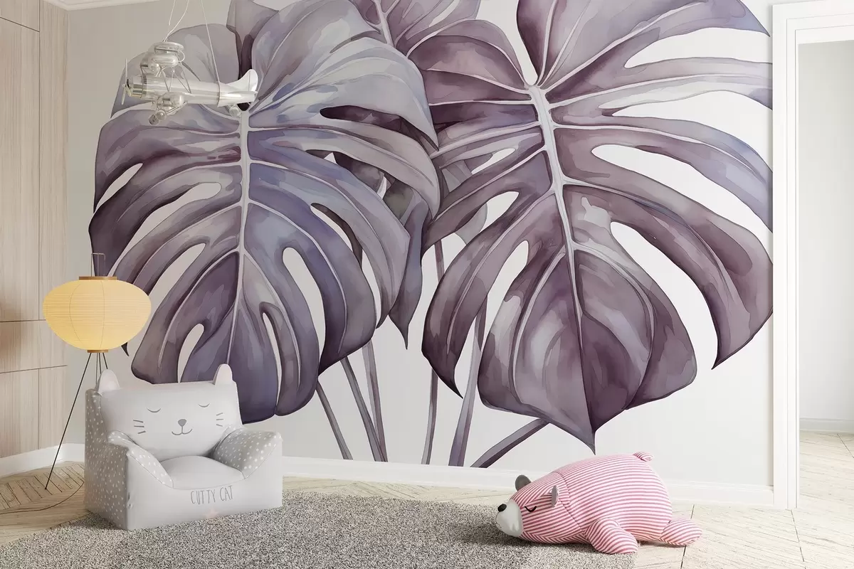 Stenske poslikave Veliki listi monstere, tropske rastline, risanje v stilu akvarela, vijolične barve Št. w03151v1