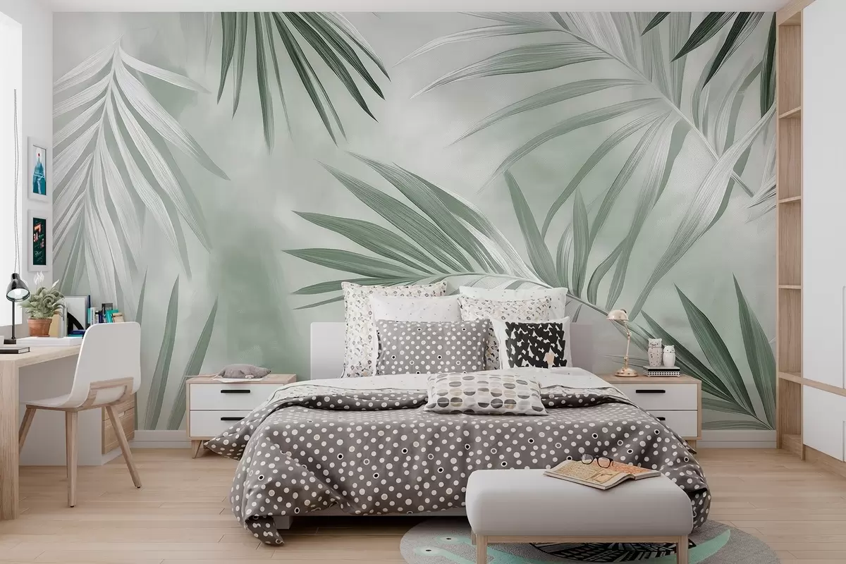 Stenske poslikave Abstrakcija tropskih listov, palma, zelena barvna paleta Št. w03153v2