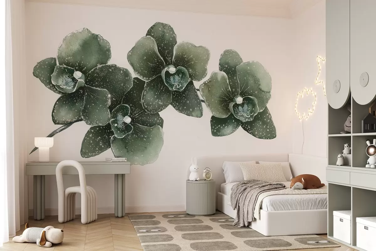 Stenske poslikave Orhidejska cvetna veja, akvarelni slog, cvetlični, zelene barve Št. w03165v1