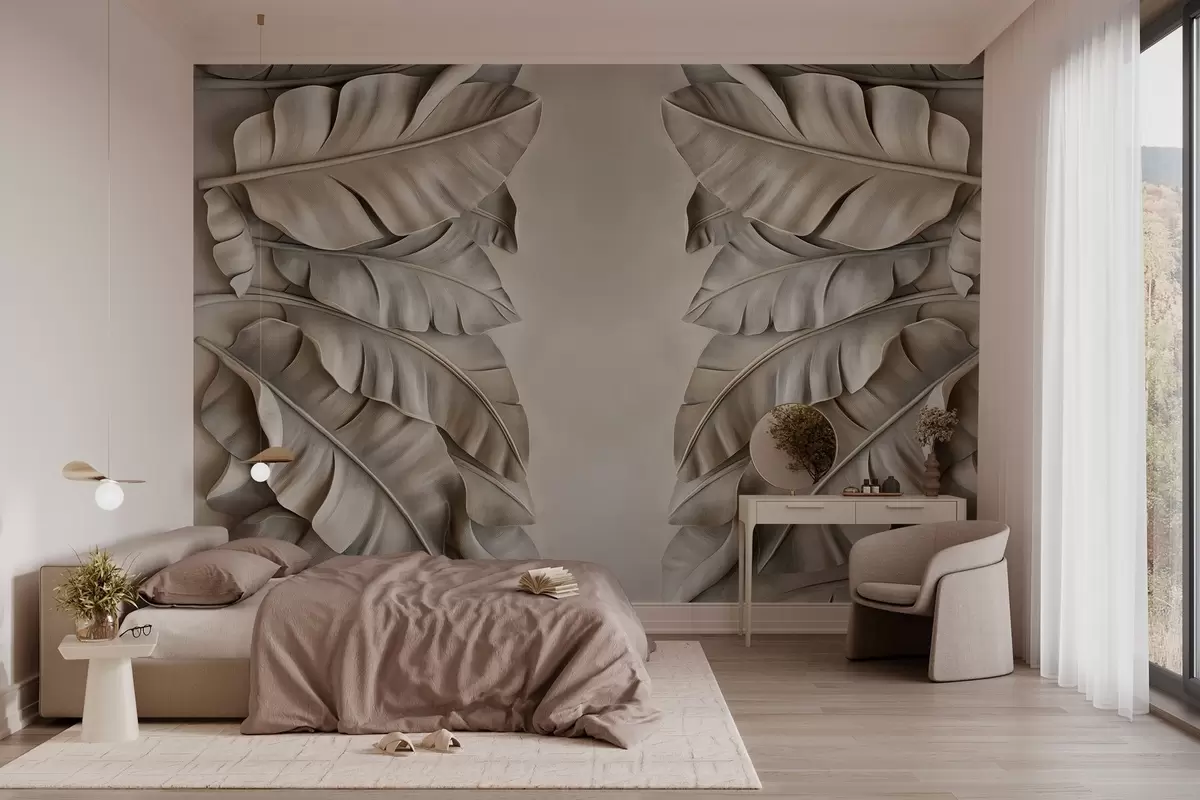Stenske poslikave imitacija basreliefa s tropskimi listi v bež odtenkih Št. w03285