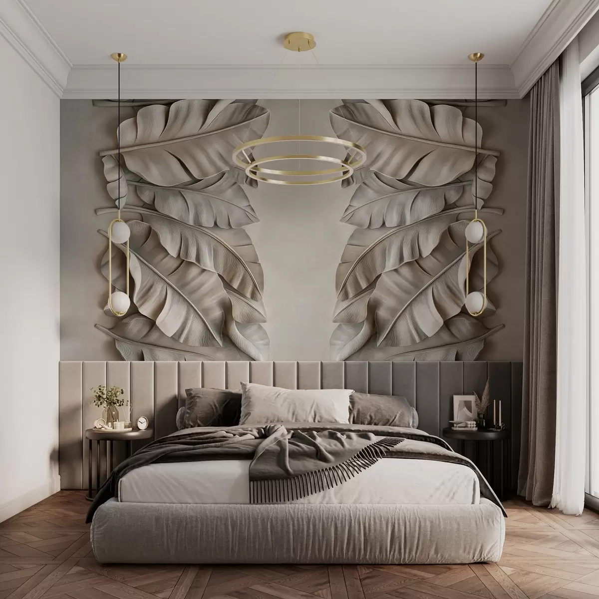 Stenske poslikave imitacija basreliefa s tropskimi listi v bež odtenkih Št. w03285