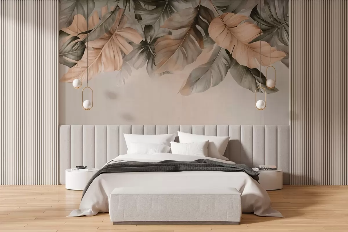 Stenske poslikave Tropski listi, ki visijo z vrha, na teksturiranem ozadju Št. w03290