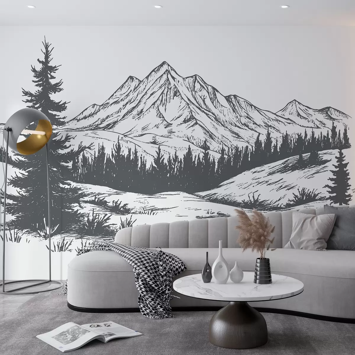 Stenske poslikave Gorska pokrajina z borovci, gozd, narava, temno siva barva Št. w03344
