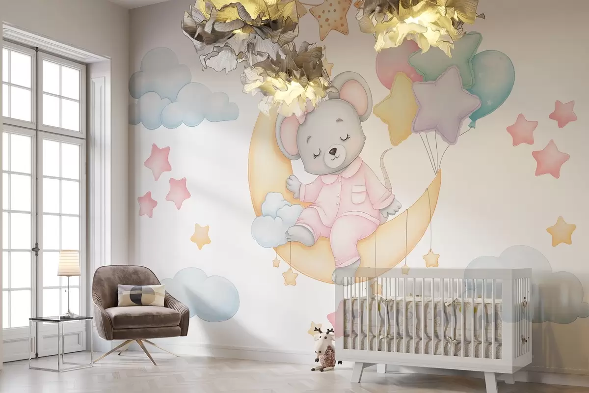 Stenske poslikave Čudovita ilustracija speče miške na luni, obdane z zvezdami, oblaki in baloni Št. w03380