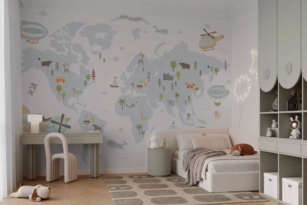 Stenske poslikave Otroški zemljevid sveta z živalmi in letali Št. w03392