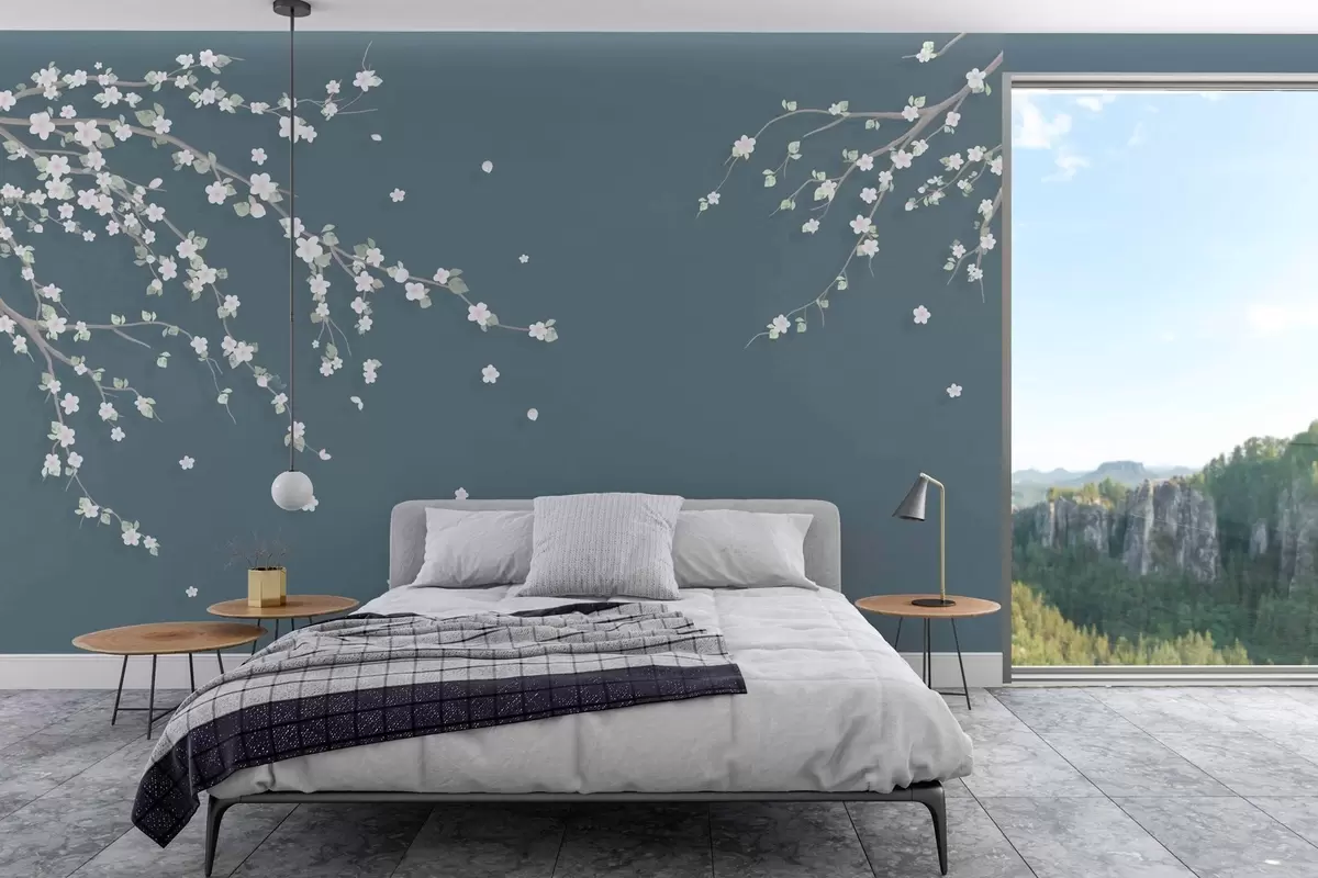 Stenske poslikave Cvetoča veja na ozadju stene v modrem grunge slogu Št. w03393v1