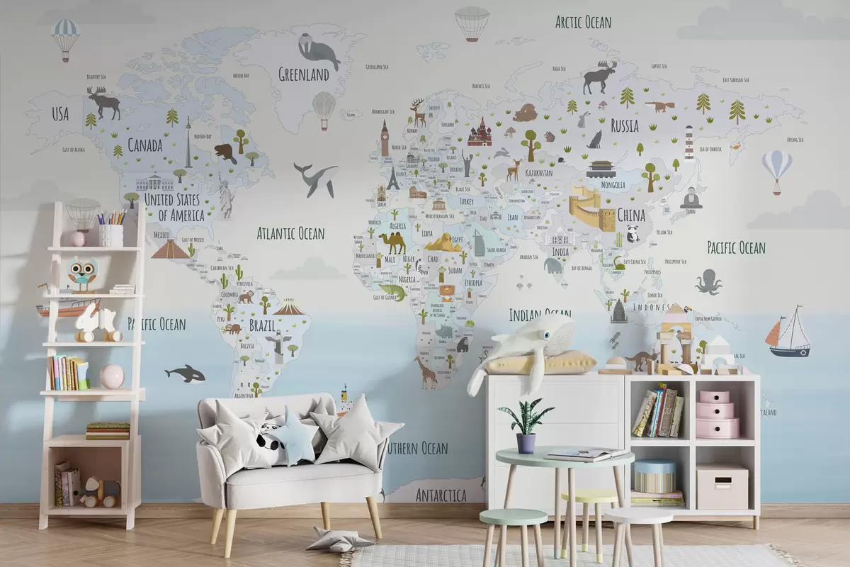 Stenske poslikave Zemljevid sveta z živalmi in znamenitostmi Št. w03410