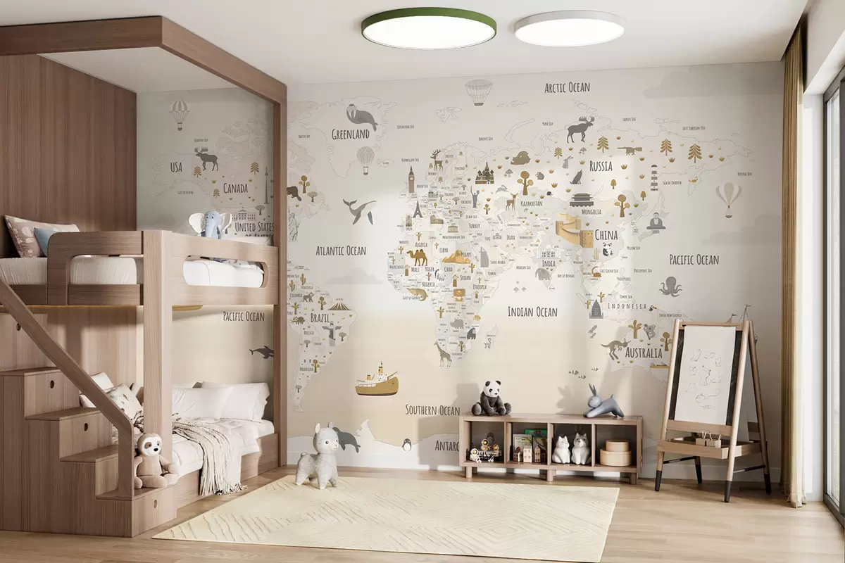 Stenske poslikave Zemljevid sveta z živalmi in znamenitostmi Št. w03410v1