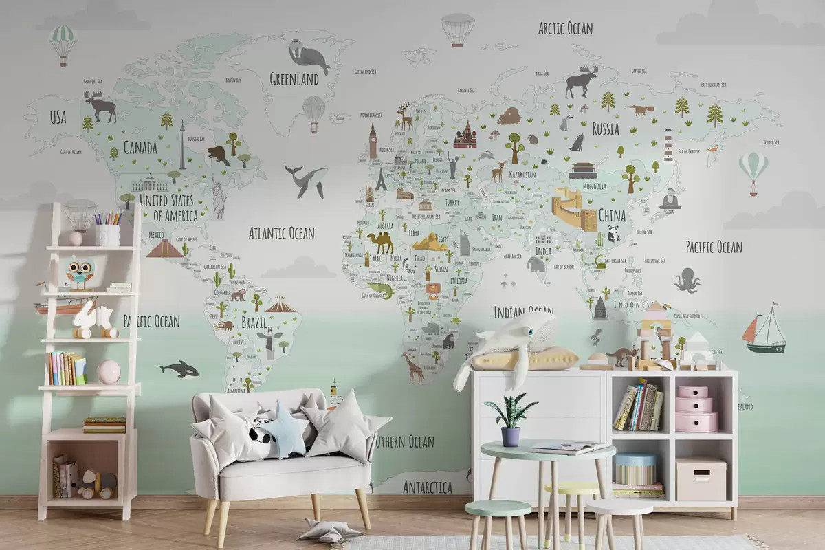 Stenske poslikave Zemljevid sveta z živalmi in znamenitostmi Št. w03410v2