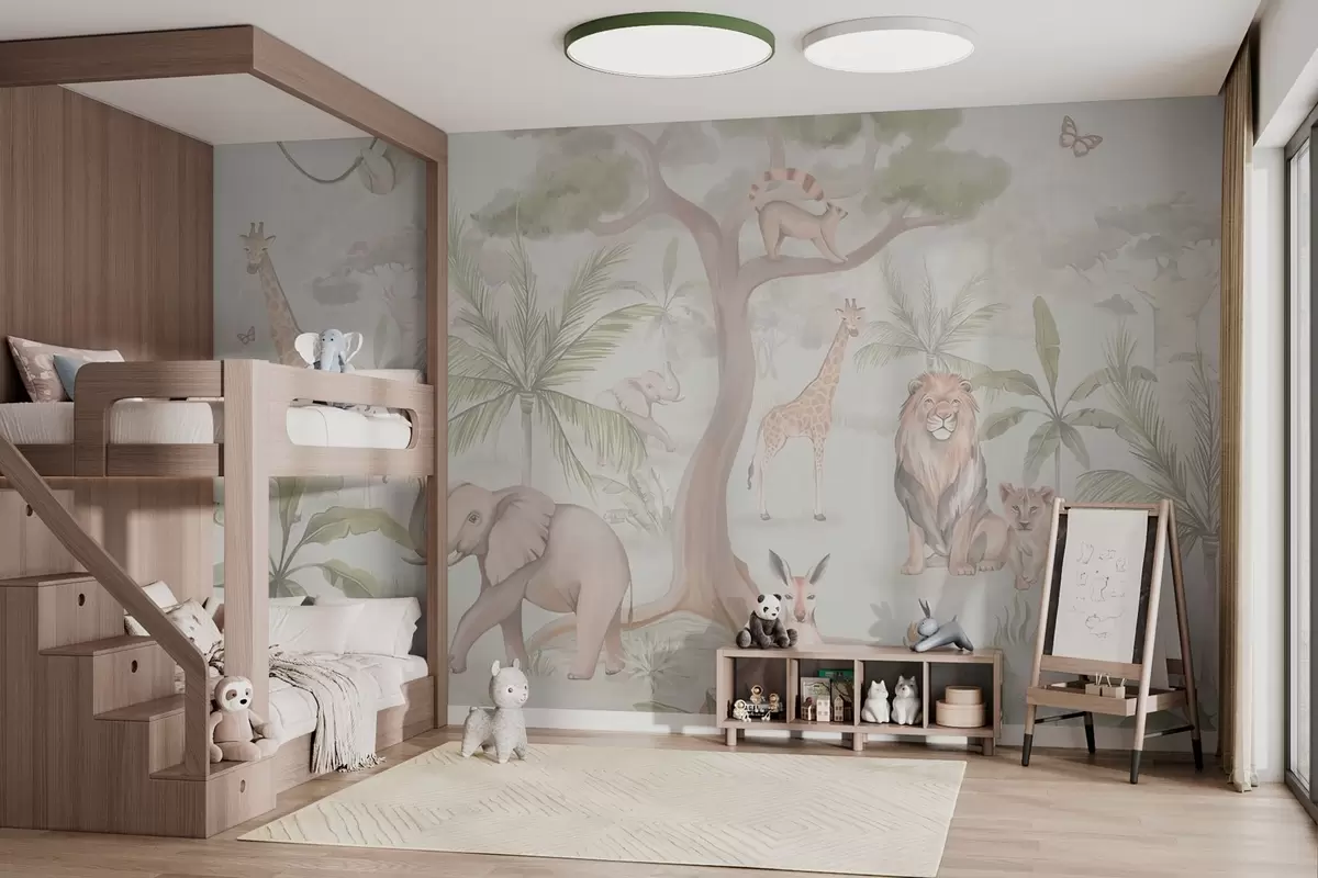 Stenske poslikave Panorama džungle z živalmi v svetlih barvah Št. w03444v1
