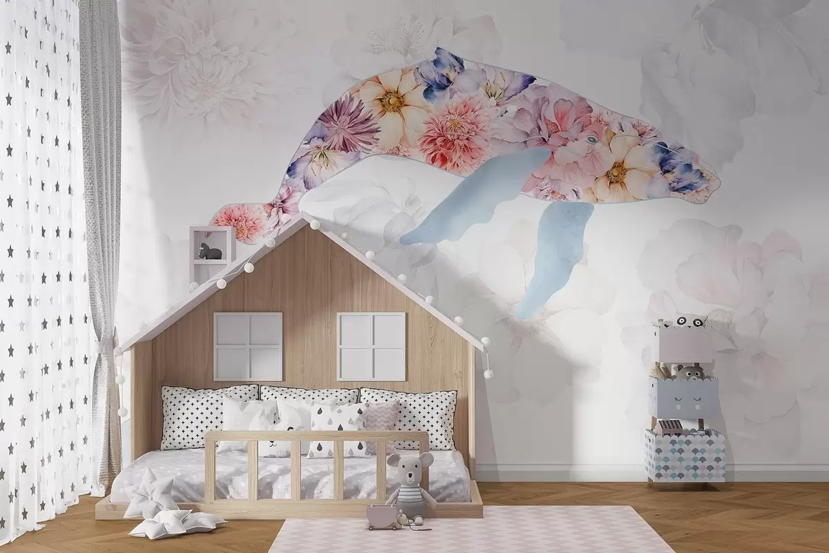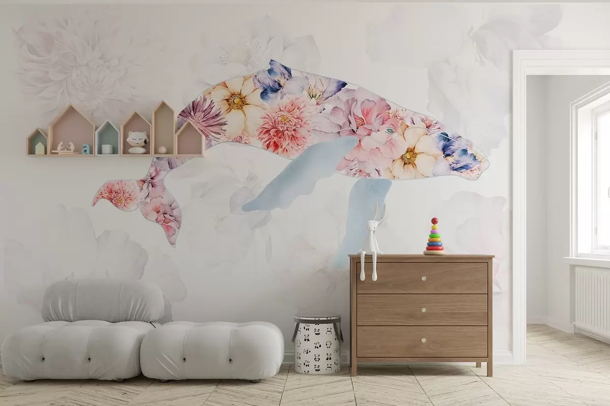 Stenske poslikave Kit z akvarelnimi cvetovi, oceanske živali, minimalizem, barvito Št. w03446
