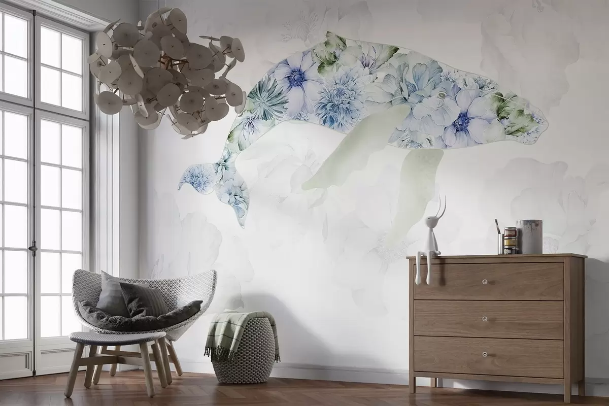 Stenske poslikave Kit z akvarelnim cvetjem, oceanske živali, minimalizem, modra in zelena Št. w03446v2