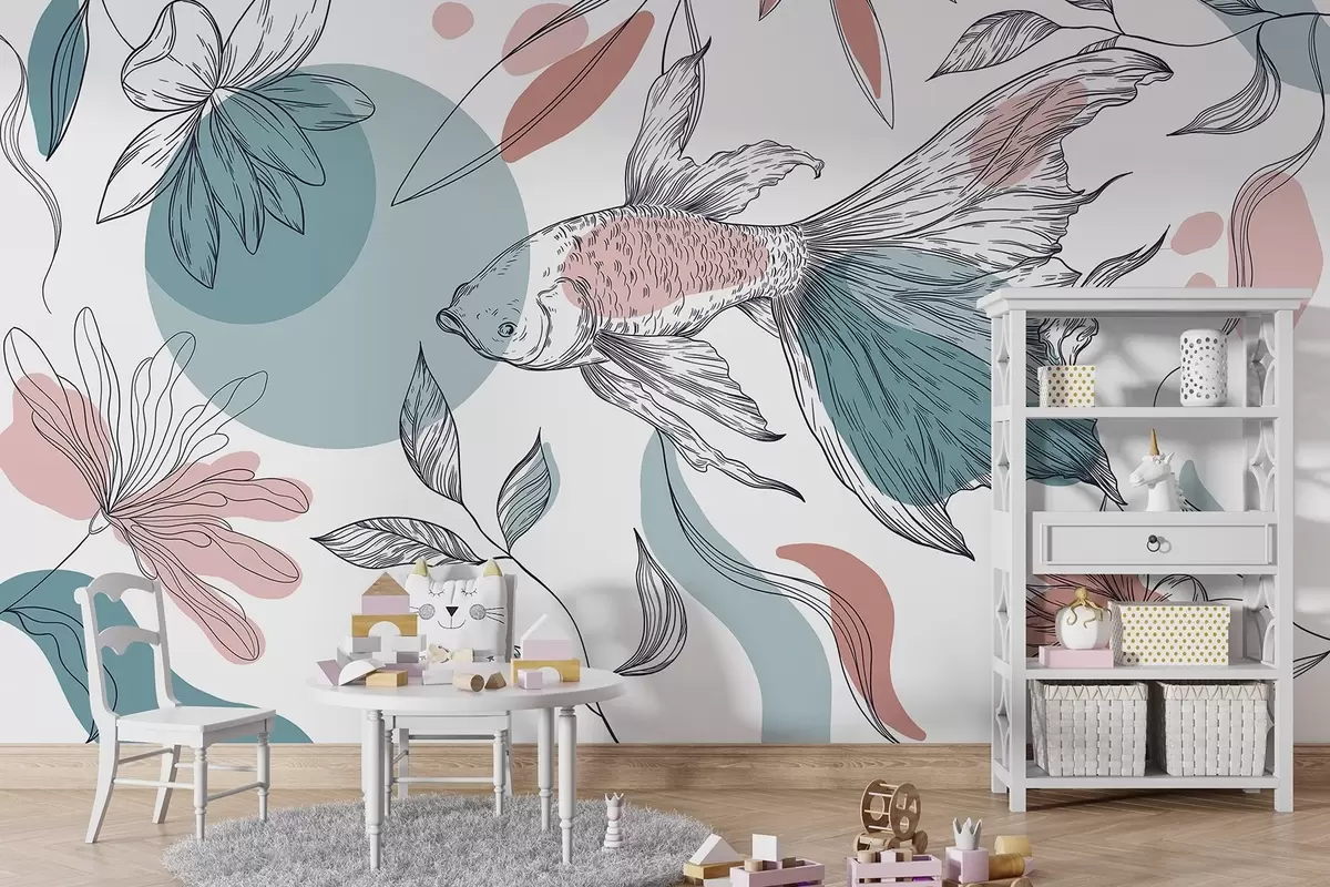 Stenske poslikave Črtna risba ribe s cvetjem, minimalizem, morska, cvetlična, modra in roza Št. w03448v1