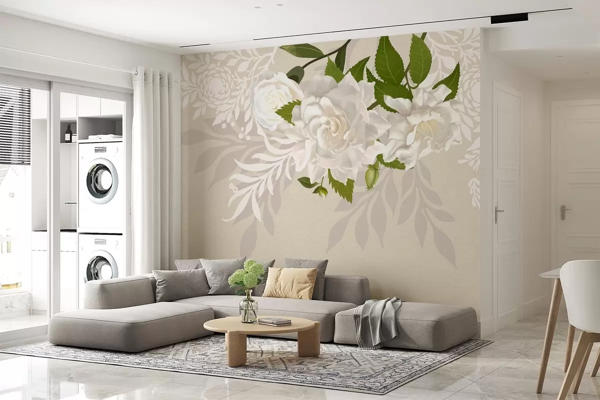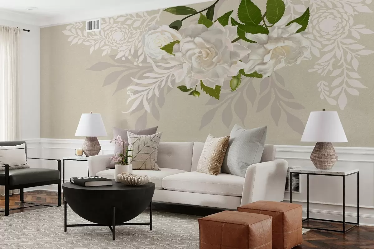 Stenske poslikave bele vrtnice na bež vzorčastem ozadju Št. w03453