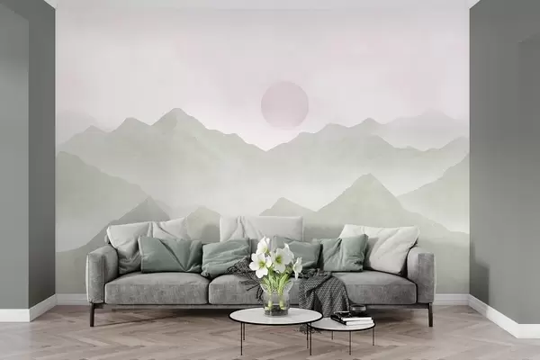 Stenske poslikave Boho slog gore pokrajina, sončni zahod, mehka pastelna, zelena Št. w03547