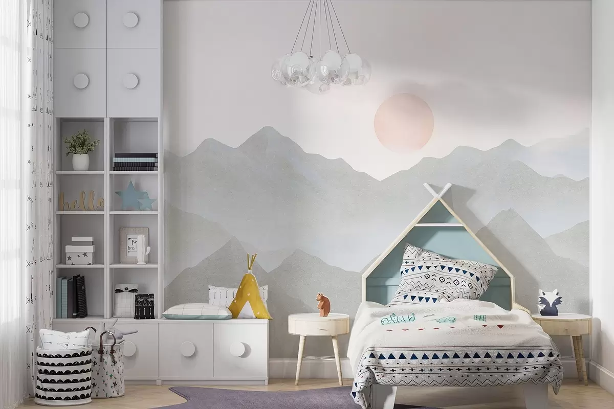 Stenske poslikave Boho slog gore pokrajina, sončni zahod, mehka pastelna, siva Št. w03547v1
