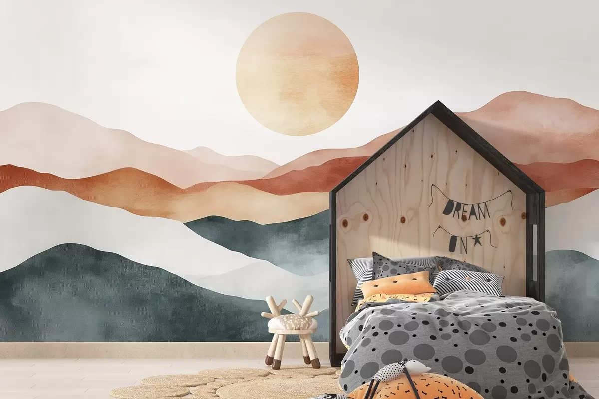Stenske poslikave Akvarelne gore s soncem, boho slog, rdeča, oranžna, siva Št. w03551