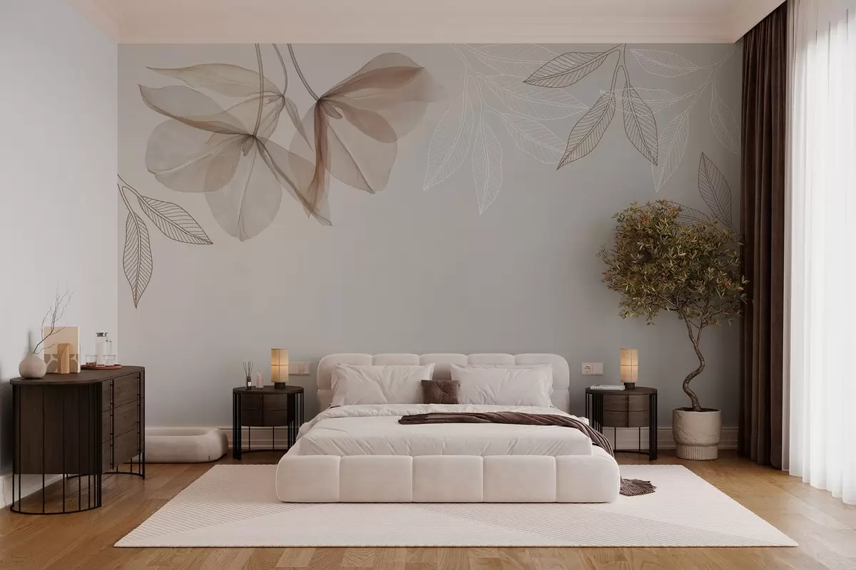 Stenske poslikave nežni prosojni cvetovi in listi v odtenkih moka Št. w03616v3