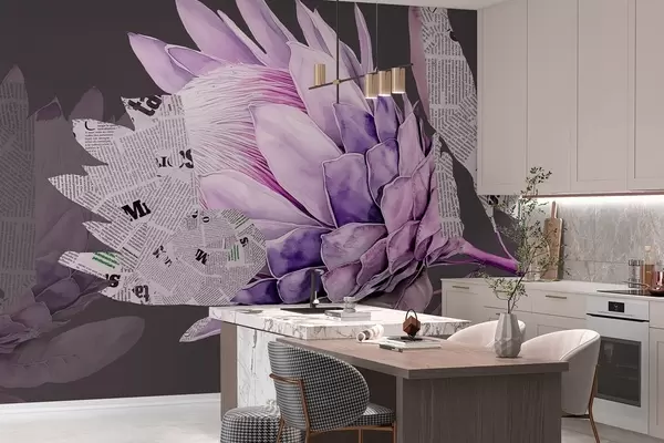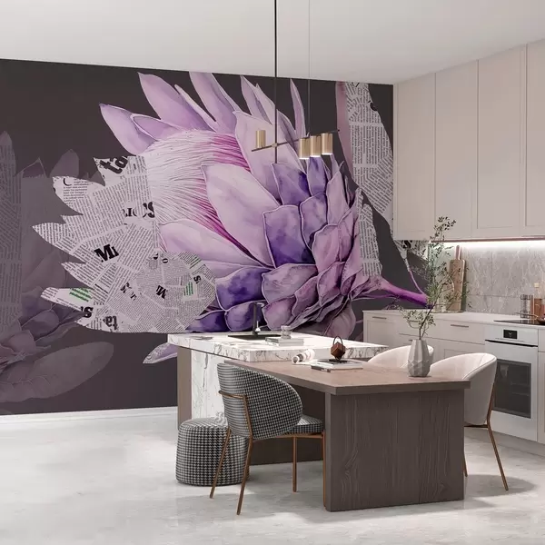 Stenske poslikave Protea cvetje, časopisna umetnost, cvetlična, tropska, temno ozadje, vijolične barve Št. w03667v2