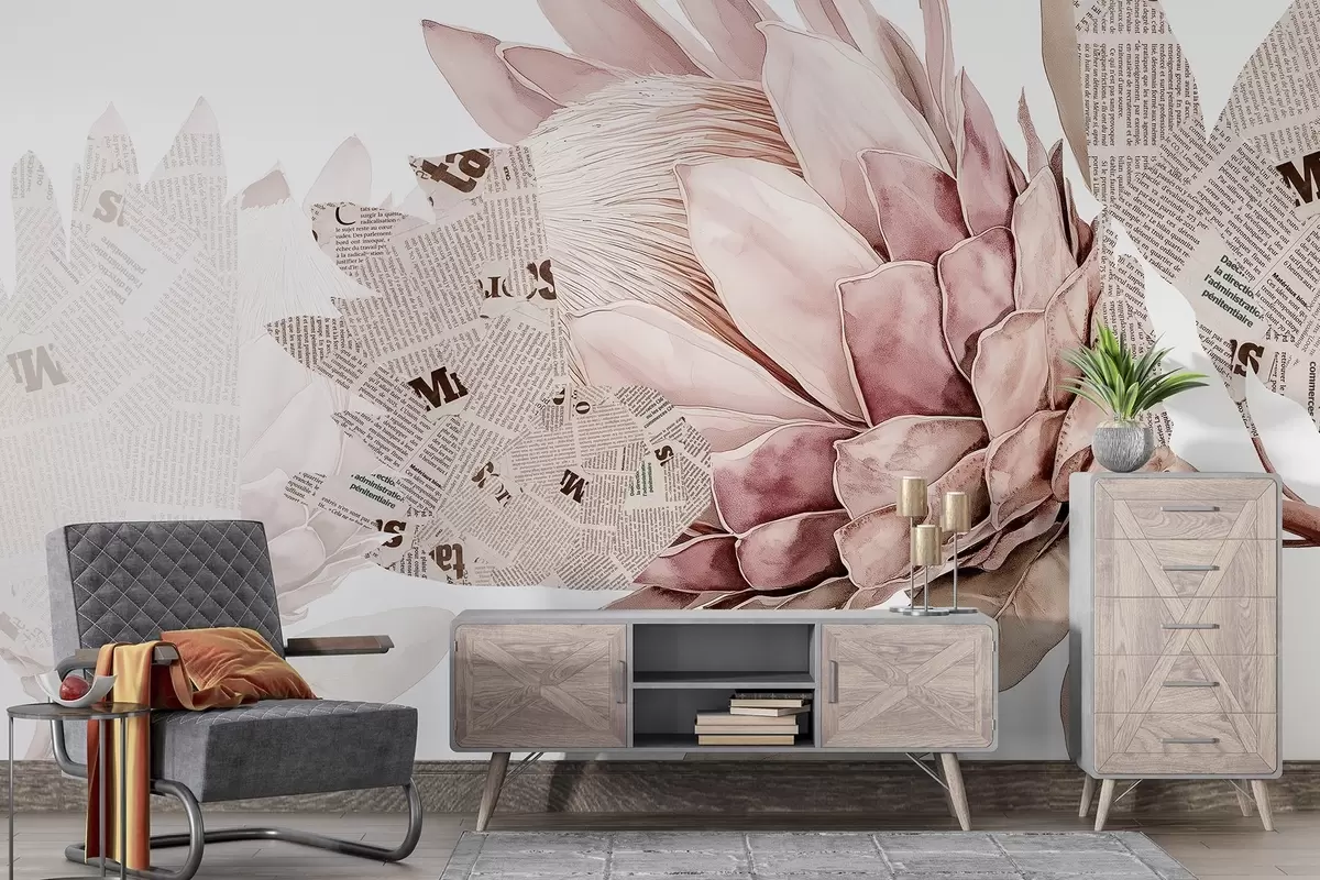 Stenske poslikave Protea cvetje, časopisna umetnost, cvetlična, tropska, pastelne bež barve Št. w03667v4