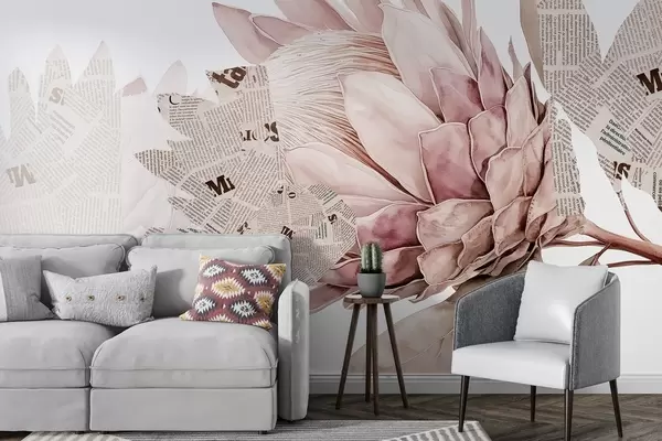 Stenske poslikave Protea cvetje, časopisna umetnost, cvetlična, tropska, pastelne bež barve Št. w03667v4