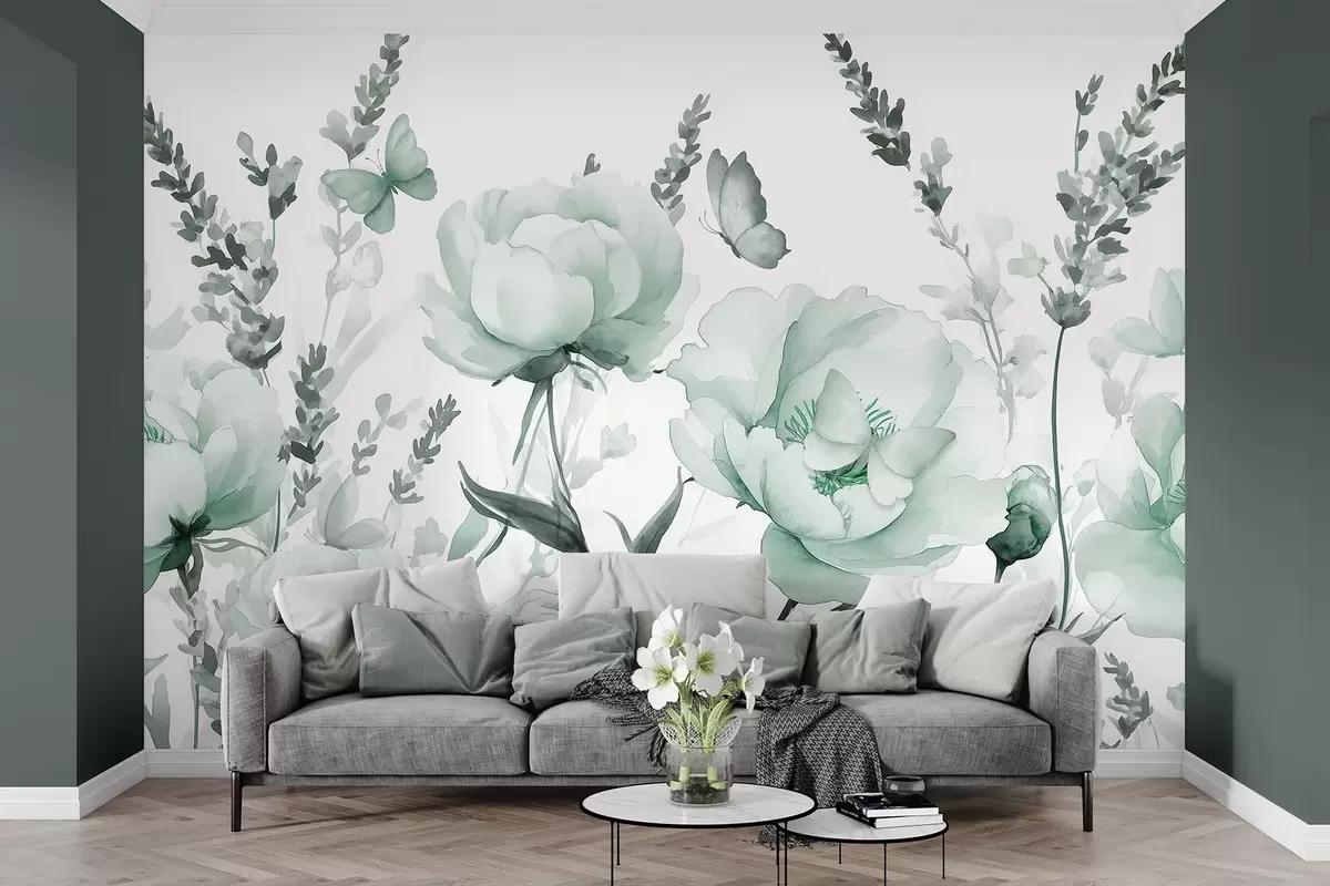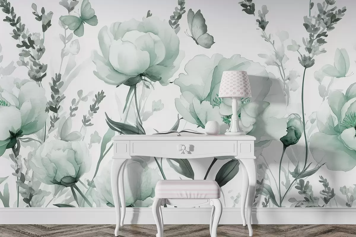 Stenske poslikave Cvetlični travnik, pivonije, sivka, metulji, akvarelni slog, zelene barve Št. w03668v1